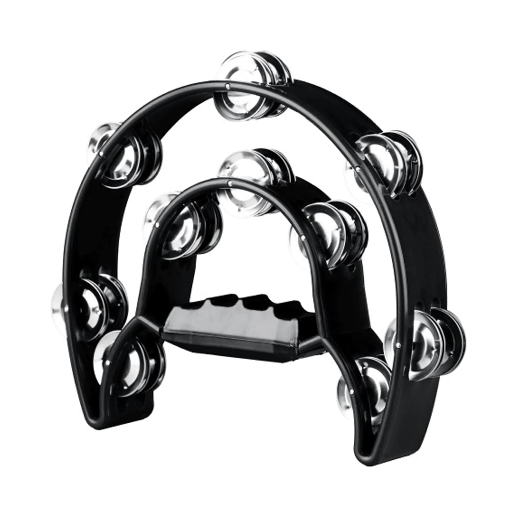 A pandeirola meia-lua é um instrumento de percussão ergonômico, em formato semicircular, com corpo de plástico resistente (ABS/policarbonato) e platinelas de inox, ideal para ritmos como samba, pagode e pop.